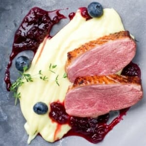 Lägg lite av hallonsåsen på tallriken, lite mos vid sidan och några skivor av ankbröstet. Strö över lite färska blåbär.