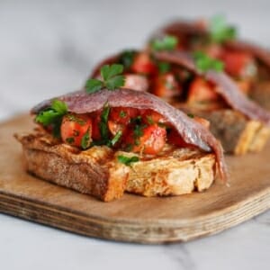 Lägg upp brödskivorna. Skeda över tomaterna. Placera tre ansjovisfiléer på varje skiva och dekorera med lite persilja. Servera ljumna.