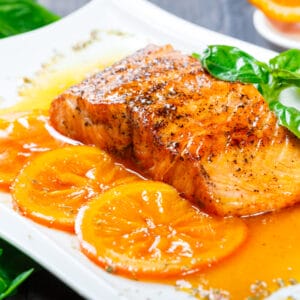 Servera laxen på apelsinskivor med lite gott ris och en sallad. Använd marinaden som sås.