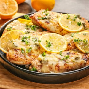 Apelsintonerna tillsammans med osten i såsen lyfter kycklingen. Lätt att laga.