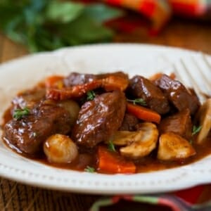Lägg i löken och purjolöken och stek den mjuk. Lägg i selleri, morötter, syltlök och svamp. Rör om och var noga med att skrapa loss allt som fastnat i botten. Tillsätt tomatpurén och rör om ordentligt. Häll i vin och fond och låt koka samman några minuter. Lägg i kryddorna och allra sist köttbitarna. Lägg på locket och ställ grytan mitt i ugnen. Låt baka i 2 1/2 timme.
