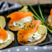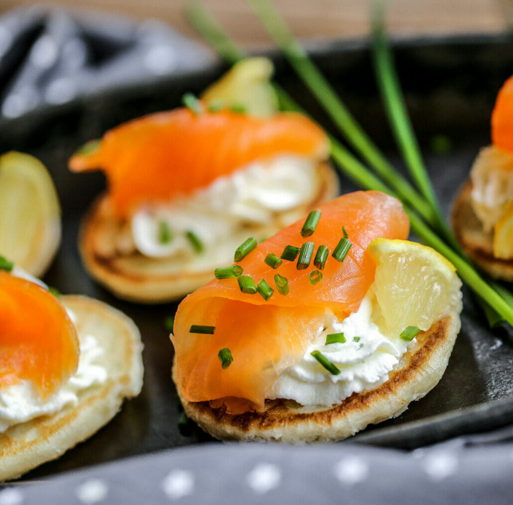 Stek blinierna hastigt i varmt smör. Lägg dem på uppläggningsfat. Pensla laxskivorna med en blandning av olivolja, citron och sesamolja. Dela laxskivorna i vardera 8 bitar (totalt 16 laxbitar). Lägg en klick creme fraiche på varje blini. Placera en liten bit citron vid sidan. Lägg en laxbit på varje blini. Dekorera med gräslök.