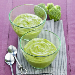Värm ugnen till 175 grader. Förbered portionsformar genom att smöra dem. Stoppa formarna i frysen och smält smör och låt sedan smöret rinna runt och fastna i den kalla formen. Koka broccolin i lätt saltat vatten, skuren i bitar i ca 10 minuter. Kör den sedan tillsammans med fonden i matberedare till jämn konsistens. Tillsätt äggen ett i sänder och kör vidare i matberedaren och därefter tillsätter du grädde och sprit och kryddor. Fyll portionsformarna. Häll kokande vatten i en stor skål och ställ skålen i ugnen. Placera portionsformarna i vattenbadet. Låt bakas ca 35 minuter. Det ska vara lite mjukt i mitten och fast runt om.