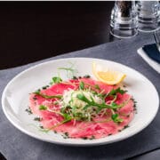 Blanda samman dressingen. Placera tonfiskskivorna på serveringstallrikarna. Placera små högar med parmesan på alla tallrikarna. Placera ut ruccola blad lite konstnärligt. Strö lite salviablad runt tonfiskskivorna längst ut. Droppa över dressingen.