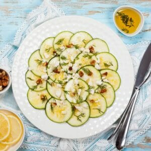 Ta zucchinin ur plasten och häll dressingen försiktigt i en liten skål. Ta skivorna en i sänder och ta bort vitlöksskivorna och lägg zucchinin på portionstallrikar. Strö över valnötter. Droppa över den sparade dressingen. Salta och peppra. Strö över dill och fetaost eller parmesan. Servera.