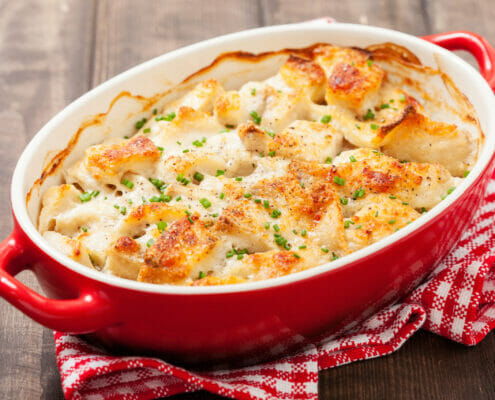 FiskDetta är en variant på en klassisk kötträtt, men med torsk och räkor byter den lite skepnad och blir både lättare och elegantare. Kvar är basen med råstekt potatis med en doft av vitlök. Värd att prova och väldigt enkel att göra.