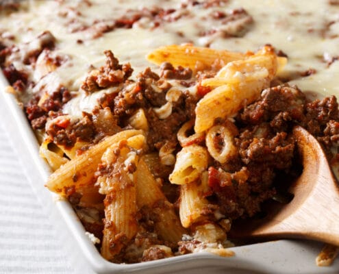 Detta är en lite lyxigare variant på pasta och köttfärssås med hackat långkokt kött och gratinerat med en ostsås i stället för bara riven ost. Ändå lätt att laga.