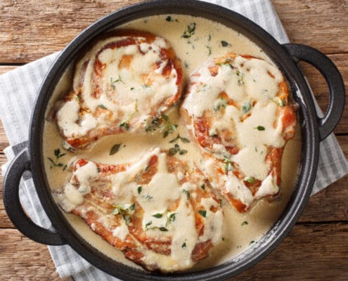Detta behöver du till fyra:4stora fläskkotletter2 tsk salt1 tsk vitpepparOlja och smör att steka itill såsen:50 g smör5…
