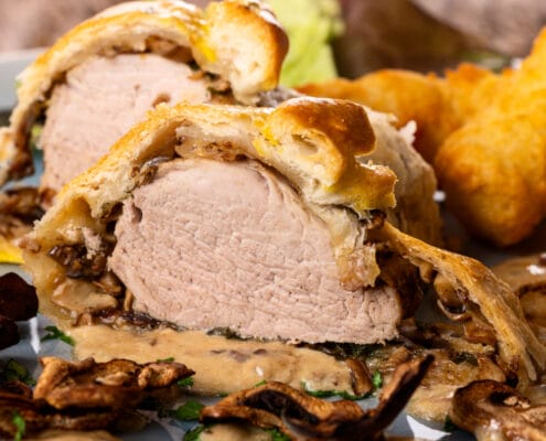 Smördegsinbakad rådjursfilé med portvinsstuvade champinjoner