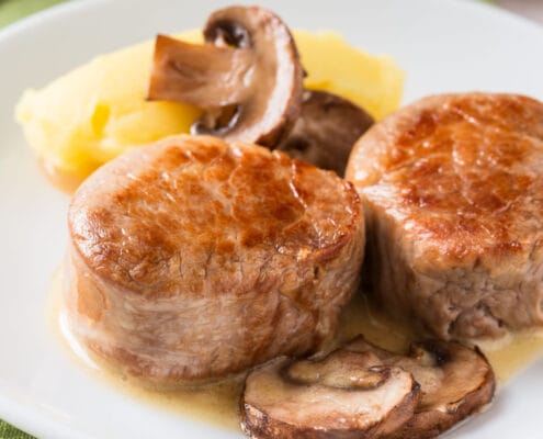 Fläskfilé med gräddstekta champinjoner och potatispuré