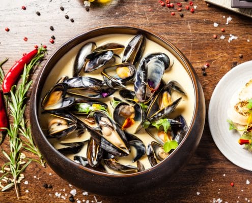 Detta behöver du till fyra som huvudrätt:1, 75 kg musslor (ca)2 vitlöksklyftor, finhackade3 schalottenlökar,…