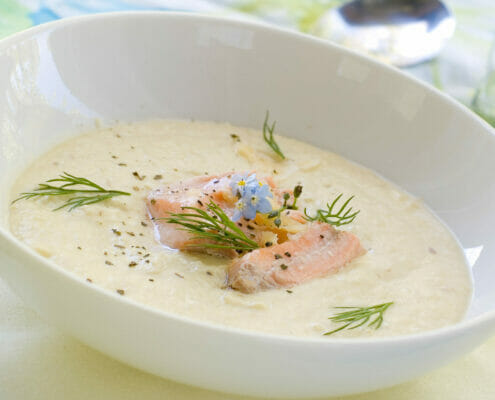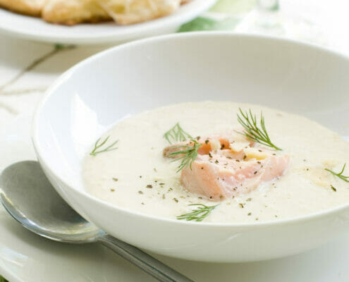 Kyld laxsoppa med laxbitar
