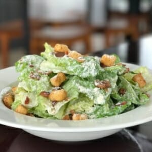 Lika enkelt som gott. Du kan lägga in lite stekt kyckling om du vill, men det blir väldigt gott bara med sallad, stekt bröd och vår utvecklade dressing. Originalreceptet innehåller också riven parmesan på toppen. Tycker du om det kan du riva över ost vid serveringen.