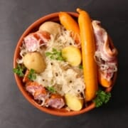 Den klassiska korvgrytan med surkål från Alsace. Det blir en smakrik och mustig rätt som är riktigt gott en kulen höstkväll. Många ingredienser men lätt att laga.