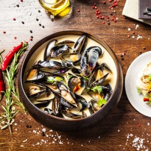 En rolig variant på de klassiska musslorna om du har ett vin med lite restsötma som matchar sötman från cidern. Läckert.