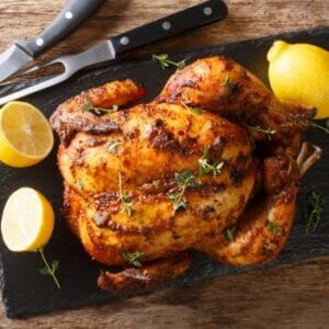 Salta och peppra kycklingen runt om och lägg den i en smord ugnsfast form. Stoppa kycklingen i ugnen i 20 minuter. Pensla därefter kycklingen med din kryddblandning och låt baka i 1 timma och 15 minuter.