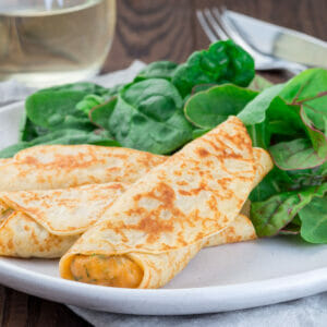 Hetta upp fyllningen. Lägg crepen på varm tallrik. Häll generöst på crepen och vik den därefter samman Peppra crepen med grovmalen svartpeppar. Servera med en sallad och lite citronklyftor.