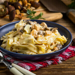 Server pastan i djup tallrik. Strö över den stekta svampen, därefter riven Västerbotten och sist hackad persilja. Ät direkt så att pastan vare sig kallnar eller stelnar.
