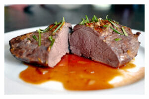 Skär upp steken med vass kniv så att skivorna blir tunna. Servera med nykokt potatis, såsen och tillbehören.