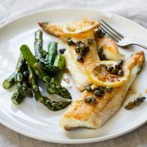Smält smöret i en stor stekpanna. När smöret är smält rör du ner vin, citronsaft och kapris i pannan. Låt det koka upp och sjuda i ca fem minuter. Salta och peppra fisken på båda sidor. Lägg ner fisken i såsen med den sidan ner som tidigare hade skinn. Fortsätt sjuda i ca tre minuter. Under tiden vinklar du stekpannan så att du kan ösa fisken med såsen lite då och då. När fisken är klar serverar du den direkt. Skopa över lite av såsen och servera med en generös citronskiva och några lätt smörstekta gröna sparris.