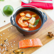 Detta är en traditionell fisksoppa med rikligt med vitlök och fin färg från några nypor saffran. Som vanligt får du breda smaker genom att kombinera flera fonder. Inte svår att göra även om det är många ingredienser.