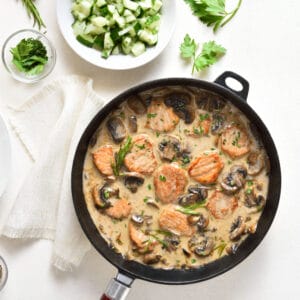 Servera med ett gott mos och gärna lite hackad gurka med en äppelciderdressing.