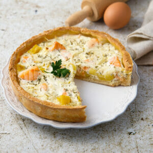 Pensla pajskalet med det vispade ägget. Fyll därefter med laxröran och platta till den med en stekspade så den blir helt jämn.