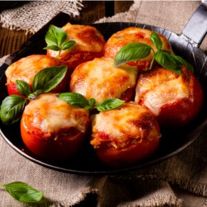 Fyll tomaterna med röran och toppa med mozzarella.