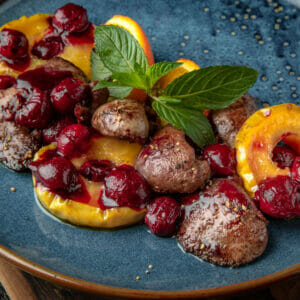 Grillad fläskfilé med äppelskivor och syltade körsbär