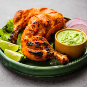 Du serverar kycklingen med såsen. Några skivor färsk rödlök och ett par klyftor lime ger en extra syra.