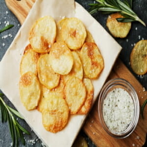 Skillnaden är enorm att göra egna chips och det är inte särskilt svårt. Följ bara alla instruktioner. Inte minst det första steget att lägga den skivade potatisen i kallt vatten.