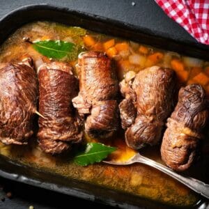 Låt koka under lock ca 1 timma. Vänd på rulladerna då och då. Ta rulladerna ur grytan. Sila vätskan och koka upp den med lite grädde. Red om du vill eller koka ner till önskad tjocklek. Servera med kokt mandelpotatis och en liten grön sallad.