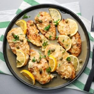 Reducera värmen till medium på stekpannan. Lägg resten av oljan och vitlöken i samma stekpanna utan att göra den ren. Låt steka ca 1 minut. Vispa ner 1 tesked mjöl. Häll därefter i pressad citron, vin och fond under kraftig omrörning. Låt koka under tre minuter. Rör i vinäger, persilja och kapris. Stäng av värmen. Vispa ner smöret lugnt och stilla. Smaka av med salt och peppar.