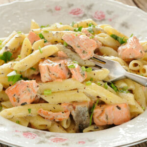 Lägg pastan i laxsåsen och rör om. Blanda snabbt och servera därefter. Garnera med lite persilja.