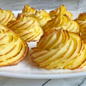 Koka potatisen med skalen på med mycket saltat vatten tills de är mjuka. Skala potatisen och mosa dem medan de är varma. Sätt ugnen på 175 grader. Rör ihop äggen med salt i en skål. Rör ner det smälta smöret och oljan. Lägg i den mosade potatisen. Lägg i parmesan och blanda noga till en fin puré. Spritsa purén till små bakelser på bakpapper. Pensla försiktigt med den vispade äggulan. Baka i 20-25 minuter till dess att ytan är gyllenbrun. Servera omedelbart till kött eller fisk. Parmesanen ger potatisen en riktigt fin smak.