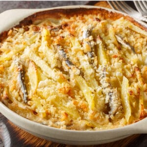 Varva potatis med lök och ansjovisfiléer i en ugnsfast form. Sprid set så jämnt som möjligt.
