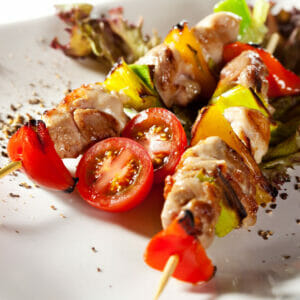Blötlägg grillspetten (om de är av trä) i 20 minuter. (Då fastnar inte köttet på spettet)