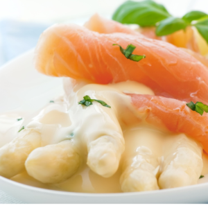 Placera sparrisen på tallrik. Lägg laxen över och häll lite av creme fraichen över sparrisen.
