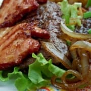 Lägg upp levern på varma tallrikar och placera sidfläsk och lökblandningen på levern. Servera genast.