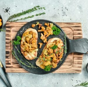 Rensa svampen med en borste (obs inget vatten). Skär bort med kniv om något är skadat eller sitter fast. Är kantarellerna stora dela dem i halvor annars tar du dem hela. Skala löken och vitlöken och hacka fint. Hacka persilja så att du får en matsked hackad. Smält smöret i stekpanna och lägg i svampen, fonden och romen; krydda med salt och peppar och stek på hög värme i 5 minuter. Lägg i hacket av schalottenlök och vitlök och stek upp under ytterligare två minuter. Lägg i creme fraiche och reducera värmen i pannan och låt det sjuda i fem minuter eller tills kantarellerna är täckta av en silkig vit reduktion. Rosta brödet under tiden (du kan steka brödet på båda sidor i smör som alternativ om du vill öka kaloriintaget). Lägg brödet på liten tallrik och häll över svampen. Garnera med finhackad persilja och servera som förrätt eller nattmat.