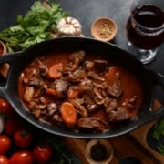 Låt sidfläsket sjuda i kokande vatten under tio minuter. Torka fläsket genom att lägga det på dubbelt hushållspapper. Stek därefter sidfläsket med oljan i en stor stekgryta på medelvärme i 3-4 minuter. Spara sidfläsket. Lägg köttet i den varma pannan efter att sidfläsket tagits bort. Låt steka till dess att köttet får färg. Lägg i lök, morötter och selleri i grytan. Lägg tillbaka sidfläsket. Blanda smör och mjöl till en pasta.  Tillsätt kryddor, schalottenlök och vitlök. Tillsätt vin och fond. Rör ner mjölblandningen i omgångar. Täck grytan med lock och låt koka 2 timmar på låg värme. Det är färdigt när köttet glider av en gaffel du tryckt i. Stek champinjonerna i lite smör. Stek till dess att de vätskar sig. Lägg champinjonerna i grytan. Smaka av med salt och peppar. Garnera med hackad persilja. Servera med nykokt potatis.