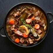 Häll i fond och vin. Låt sjuda på låg värme under lock i 1 1/2 timma. Smaka av med salt. Lägg i morötterna. Koka ytterligare 15 minuter. Servera på tallrik med basmatiris och garnera med färsk persilja.