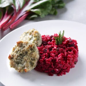 Värm oljan i en tjock kastrull. Lägg i den hackade löken och låt den fräsa mjuk. Tillsätt hälften av rödbetorna och blanda ordentligt. Lägg i riset och rör. Fortsätt röra till dess att riset börjar fastna och nästan få lite färg. Häll i vinet och vinägern och rör om ordentligt. När all vätska försvunnit blandar du samman fonderna med vattnet och spär i omgångar under omrörning. När fonden är borta häller du i lite ny fond och fortsätter till dess att all fond absorberats. Häll i romen och tillsätt smöret och låt det smälta in under omrörning. Innan serveringen tillsätter du grädden och rör om så att all grädde blandats ner. Tillsätt den rivna osten och rör till dess att den smält. Tillsätt de resterande rödbetorna allra sist. Servera. Garnera gärna med lite riven persilja och ett gott bröd.