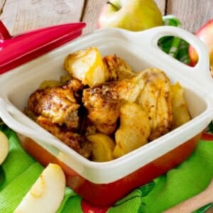 Sätt ugnen på 175 grader. Placera kycklingen i en stor stekpanna eller ugnsfast fat. Häll över marinaden inklusive lök och citronskivor. Placera äppelbitar och potatis runt kycklingen. Lägg på lock eller metallfolie. Baka i 1 timma och 15 minuter. Rör efter halva tiden så att allt får marinad på sig. Servera med färska timjankvistar.