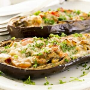 Lägg i färsblandningen i aubergineskalen. Lägg på den rivna osten. Gratinera i ugnen ca 10 minuter eller till dess att osten får färg. Servera.