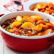 En lite gammaldags anrättning. Röda potatisar har väldigt lång historia i Sverige och tål ett långkok riktigt bra. Lättlagat.
