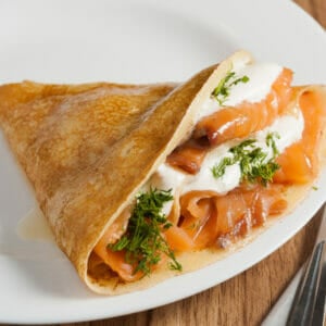 Lägg ut de varma crepen och lägg på den varma laxröran på halva crepen. Lägg på lite av mandelpeston och stäng crepen genom att vända över den tomma halvan.Vill du kan du lägga på lite persilja som dekor.