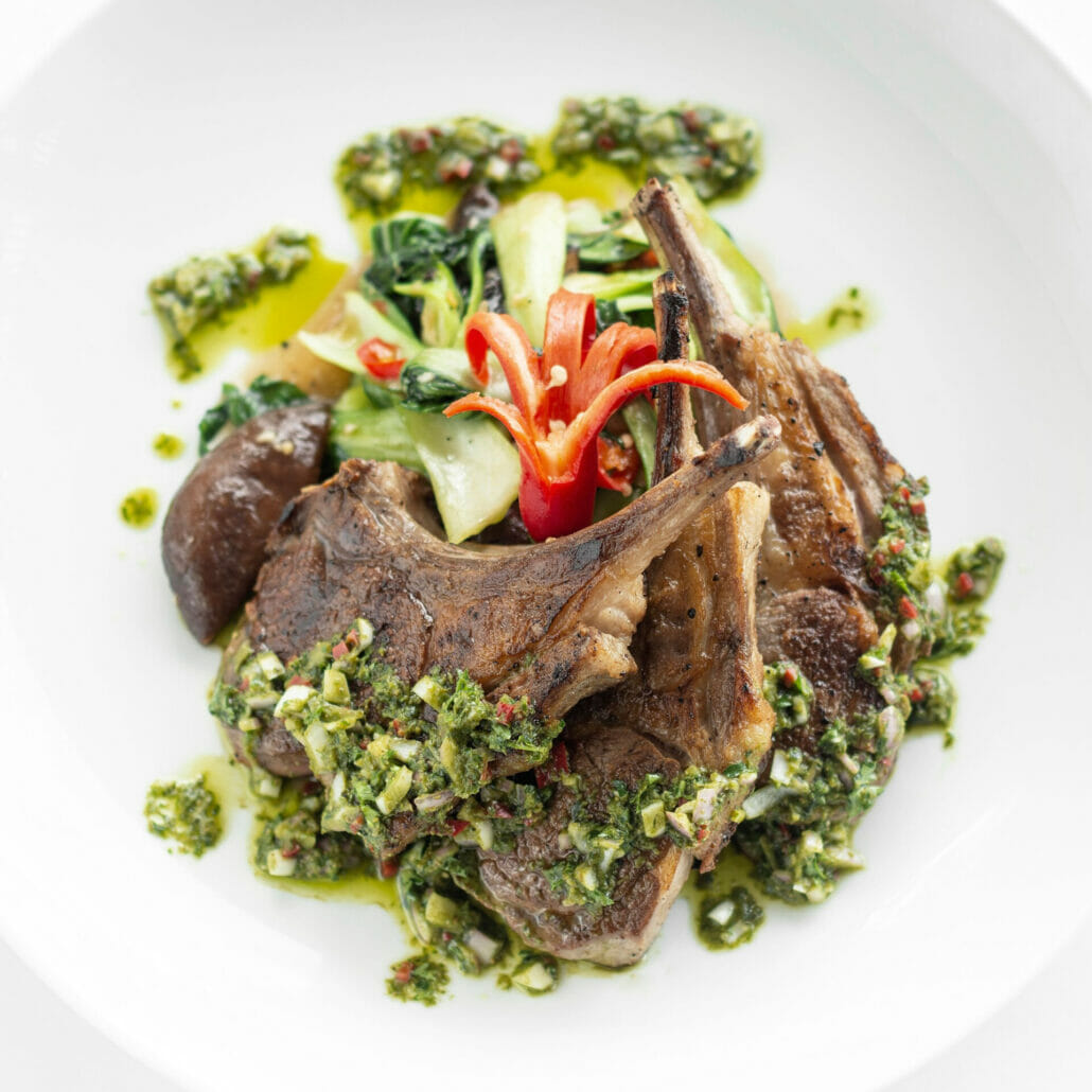 Flytta kotletterna till ett ugnsfast fat. Häll över mint-chimichurrin. Ställ mitt i ugnen och baka i tio minuter.