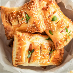 Skär smördegsplattorna i ca 2 dm stora fyrkanter. Lägg dem på bakpapper på en plåt. Lägg på köttfärsröra på hälften och vik samman till en tär bakelse. Skär tre snitt på toppen så att vätskan kan ånga bort. Pensla med vispat ägg och strö över sesamfrön