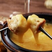 Doppa brödbitar i osten med en gaffel. Akta munnen så att du inte bränner dig.